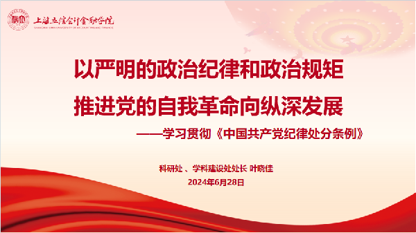 为深入学习贯彻《中国共产党纪律处分条例》,引导支部党员树立党纪意识,坚守纪律底线,进一步严明党的政治纪律和政治规矩。6月28日下午,科研处党支部书记叶晓佳讲授了题为《以严明的政治纪律和政治规矩、推进党的自我革命向纵深发展》的专题党课,支部全体党员参加学习。