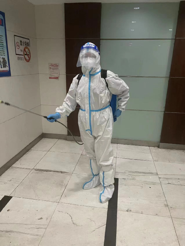 党员干部朱伟在楼栋内消毒